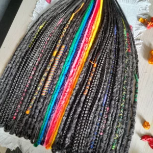 Chaque dread est une symphonie de couleurs où la base noire profonde sert de toile aux arcs éclatants de l’arc-en-ciel. Comme un rêve tissé de nuances vives et contrastées, ces dreads transforment votre look en une œuvre d’imagination et de merveille.