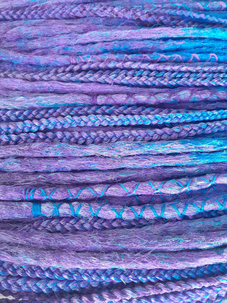 Des dreads qui évoquent les profondeurs galactiques de l’océan, avec des nuances cosmiques de bleus et violets. Chaque mèche est une exploration onirique des mystères de l’univers marin.