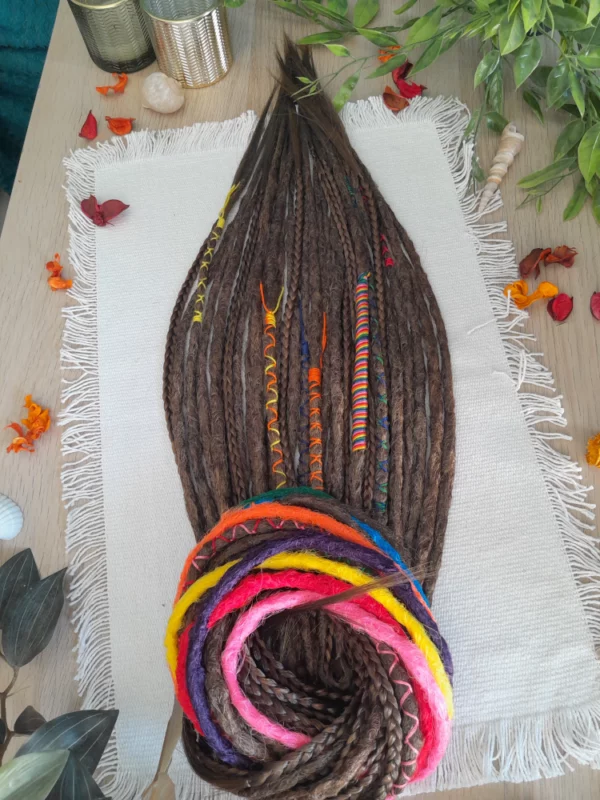 Les Woodland Forest Rainbow Dream Dreads capturent l’essence de la nature en combinant les riches teintes châtaines du bois avec la magie des couleurs arc-en-ciel. Le châtain, évoquant la chaleur et la robustesse des forêts, s’harmonise parfaitement avec les éclats vibrants de l’arc-en-ciel.